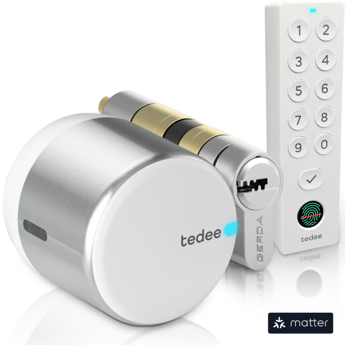 Serratura smart Tedee GO2 con cilindro certificato e tastierino wireless Tedee Keypad PRO per sblocco con PIN e impronta digitale.