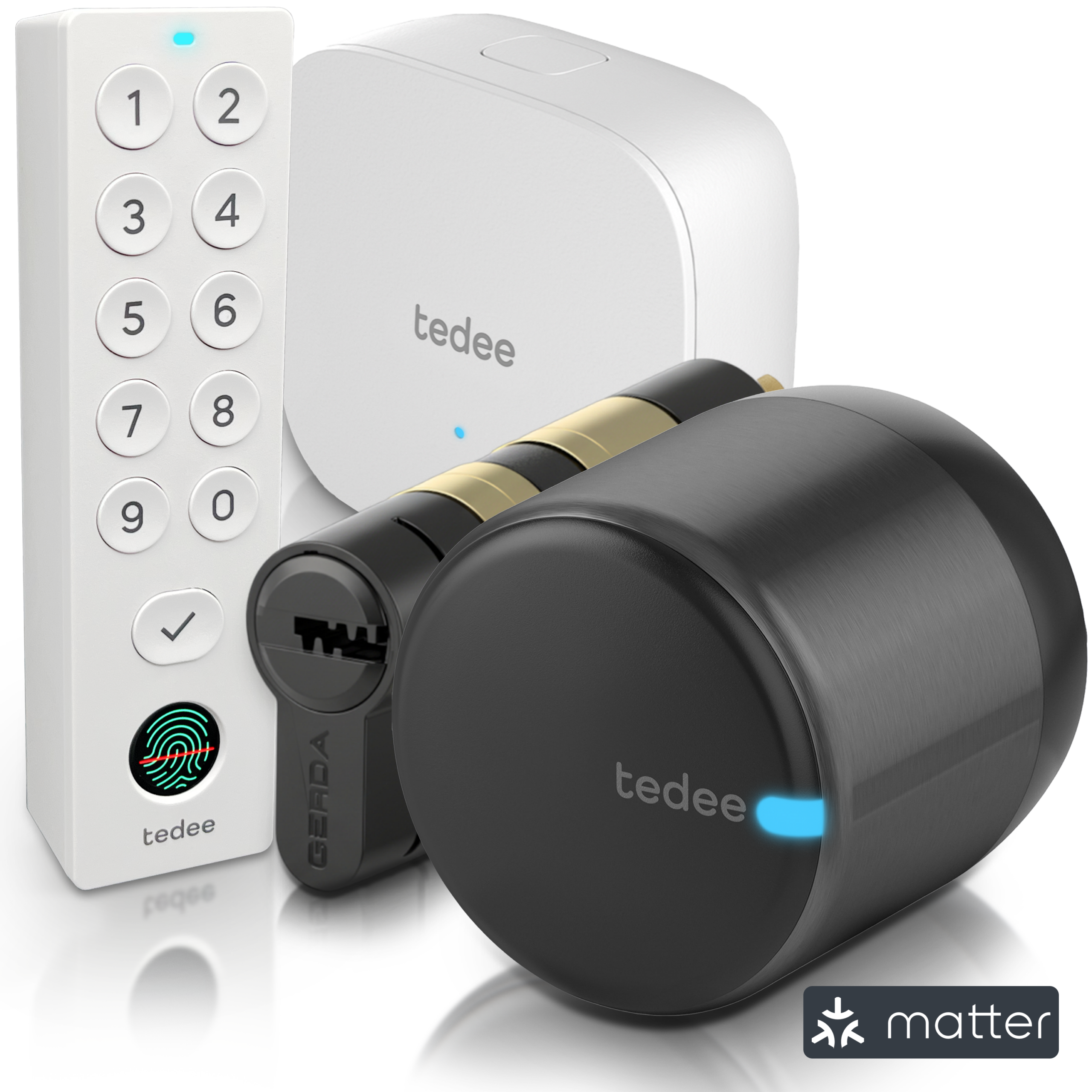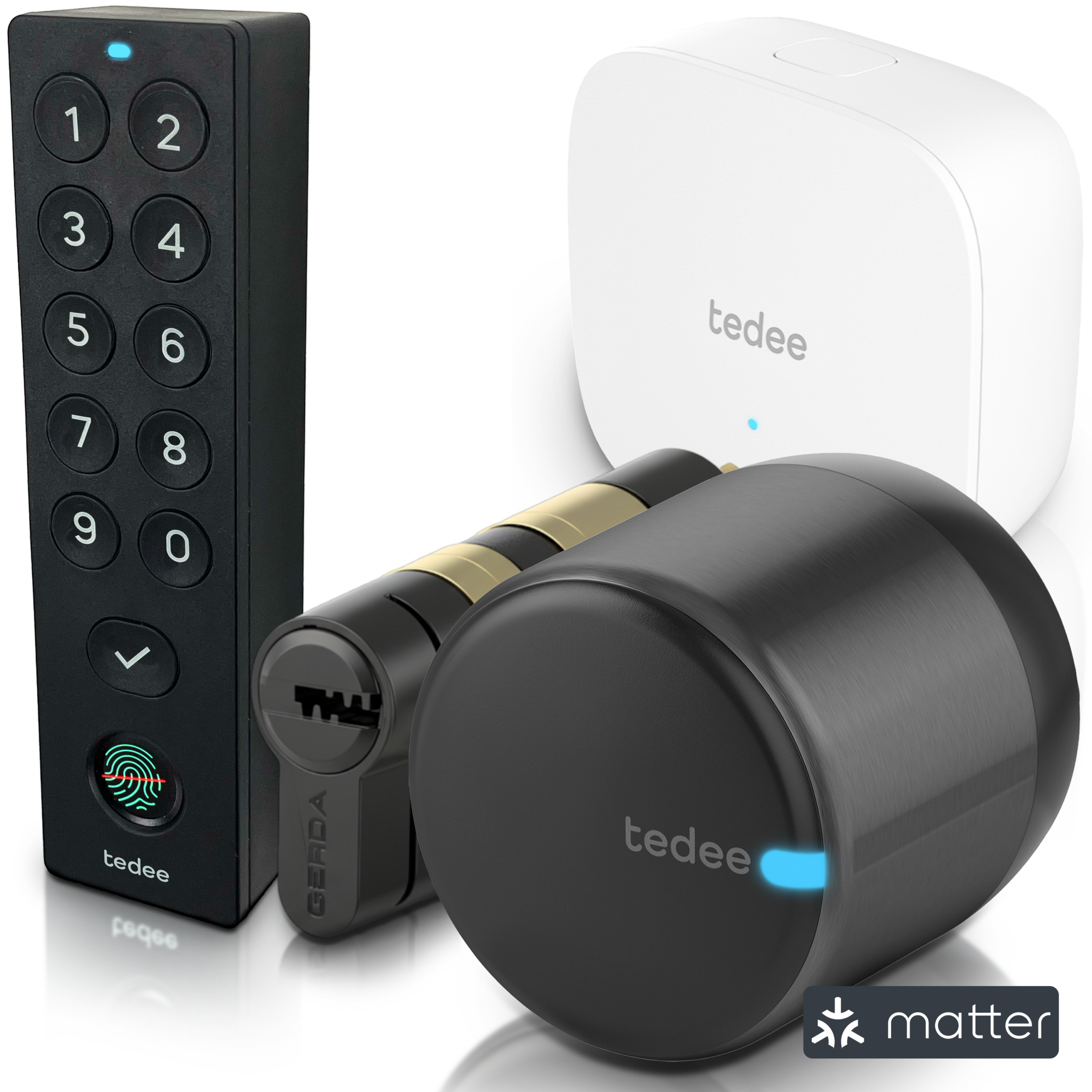 Van smartphonebediening en afstandsbediening tot PIN-ontgrendeling: deze bundel bevat Tedee GO2, Tedee Bridge en Tedee Keypad PRO, voor een volledig sleutelloze ervaring.
