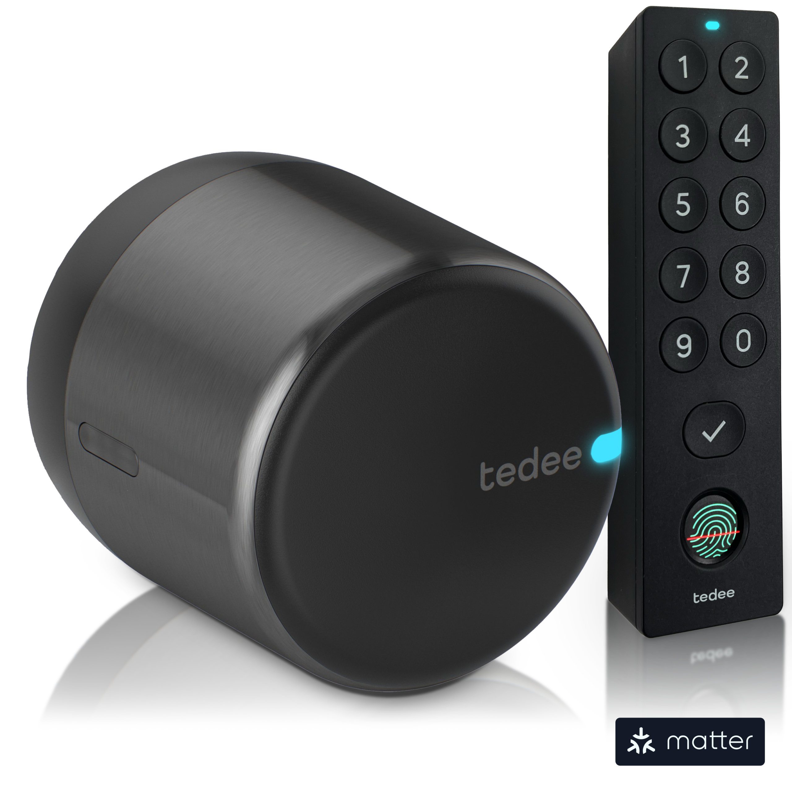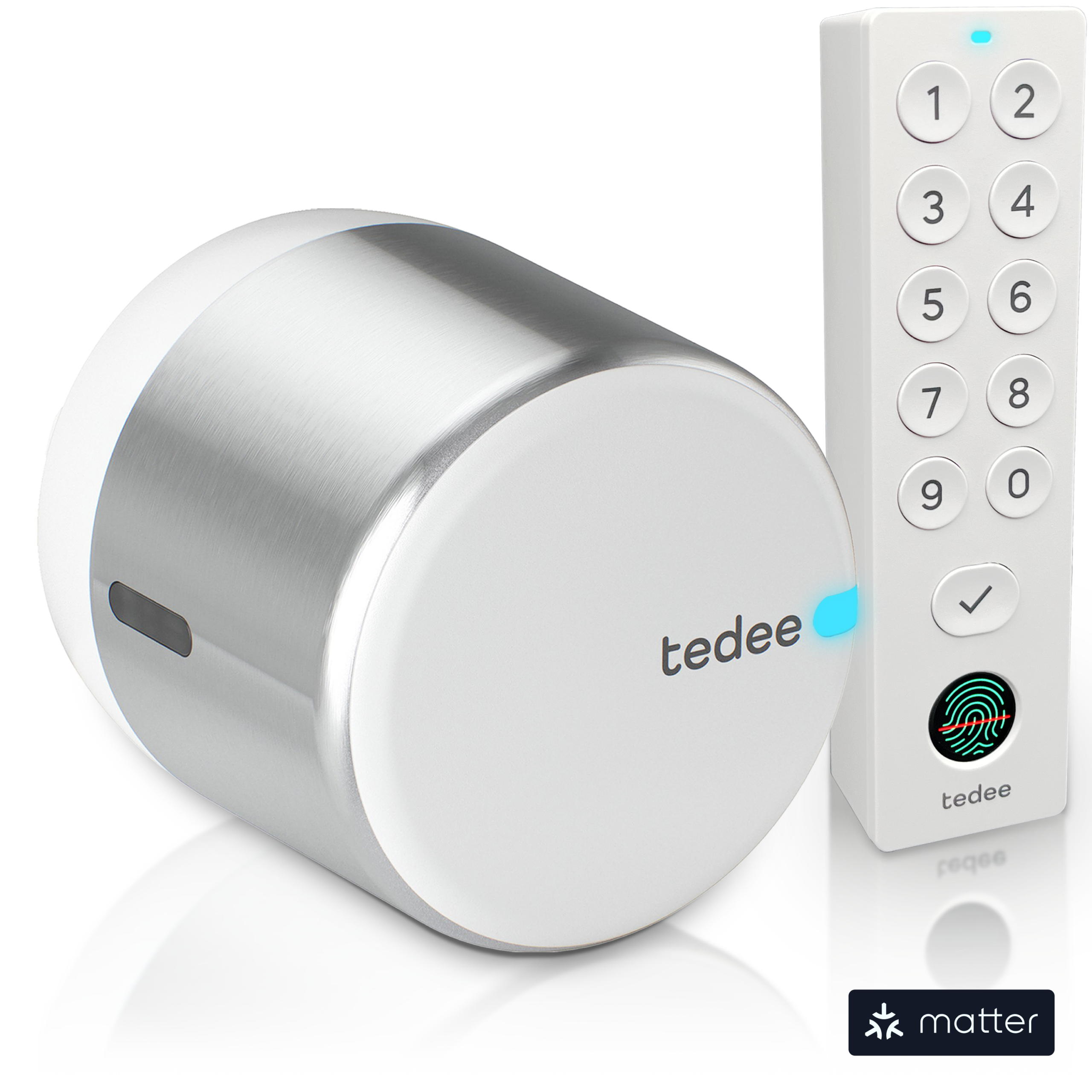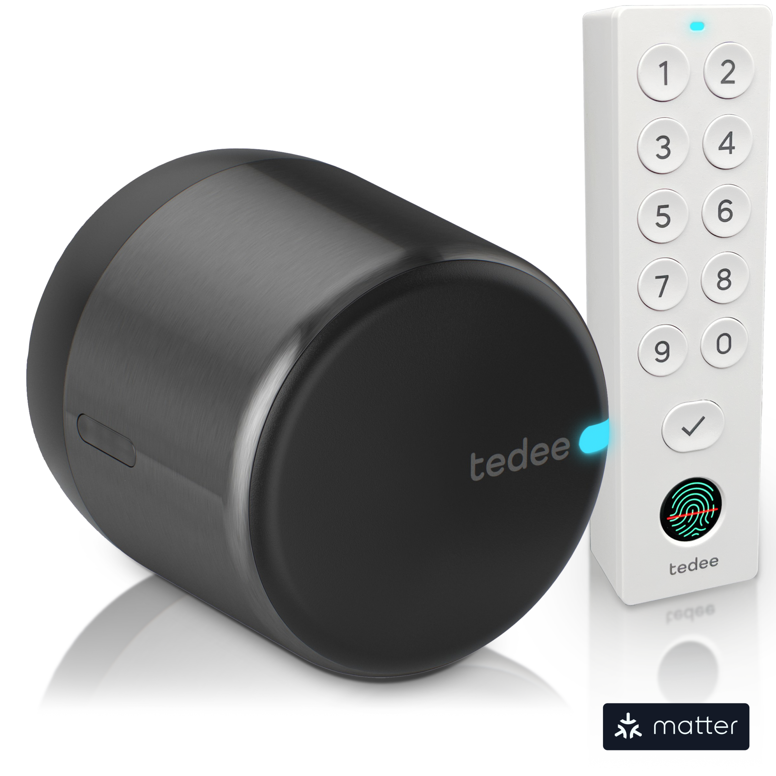 Fechadura inteligente Tedee GO2 com cilindro certificado e teclado sem fio Tedee Keypad PRO para desbloqueio por PIN e impressão digital.